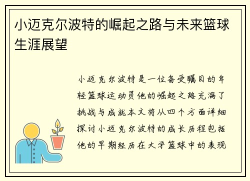 易建联作为中国篮球的代表性人物,其重返赛场备受关注。他带着丰富的经验和不屈的斗志再次出现在球迷面前,为球队争夺总冠军荣耀而努力。在这篇文章中,我们将从多个方面探讨易建联重返赛场所展现的风采,分析他对球队的重要性,以及在追逐总冠军之路上所发挥的关键作用。我们将从他的身体状态、领导能力、比赛表现及对年轻球员的影响等四个方面深入剖析,总结易建联如何成为球队不可或缺的一部分,以及他在整个赛季中为球队注入的...