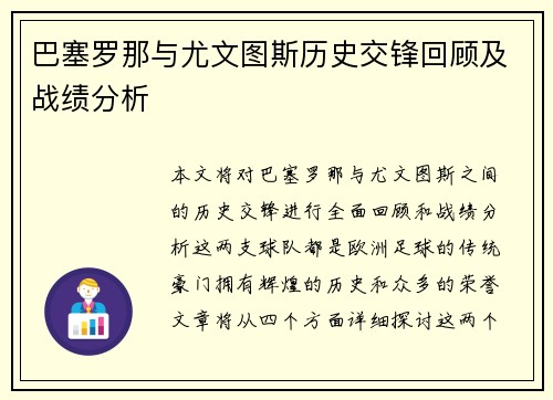 在足球的历史长河中,巴萨与尤文图斯的对决是一场备受瞩目的巅峰之战。913年,两支球队在欧冠赛场上的交锋,让全世界的球迷为之疯狂。这场比赛不仅仅是比分的较量,更是战术智慧与球员技艺的全面展示。通过对这场比赛的回顾,我们能够深入了解两队在战术部署、球员表现以及比赛结果等方面的重要细节。本文将从精彩回顾、战术分析、关键球员表现和赛后影响四个方面,对这场经典对决进行详细阐述,以展现这场巅峰之战的独特魅力。...